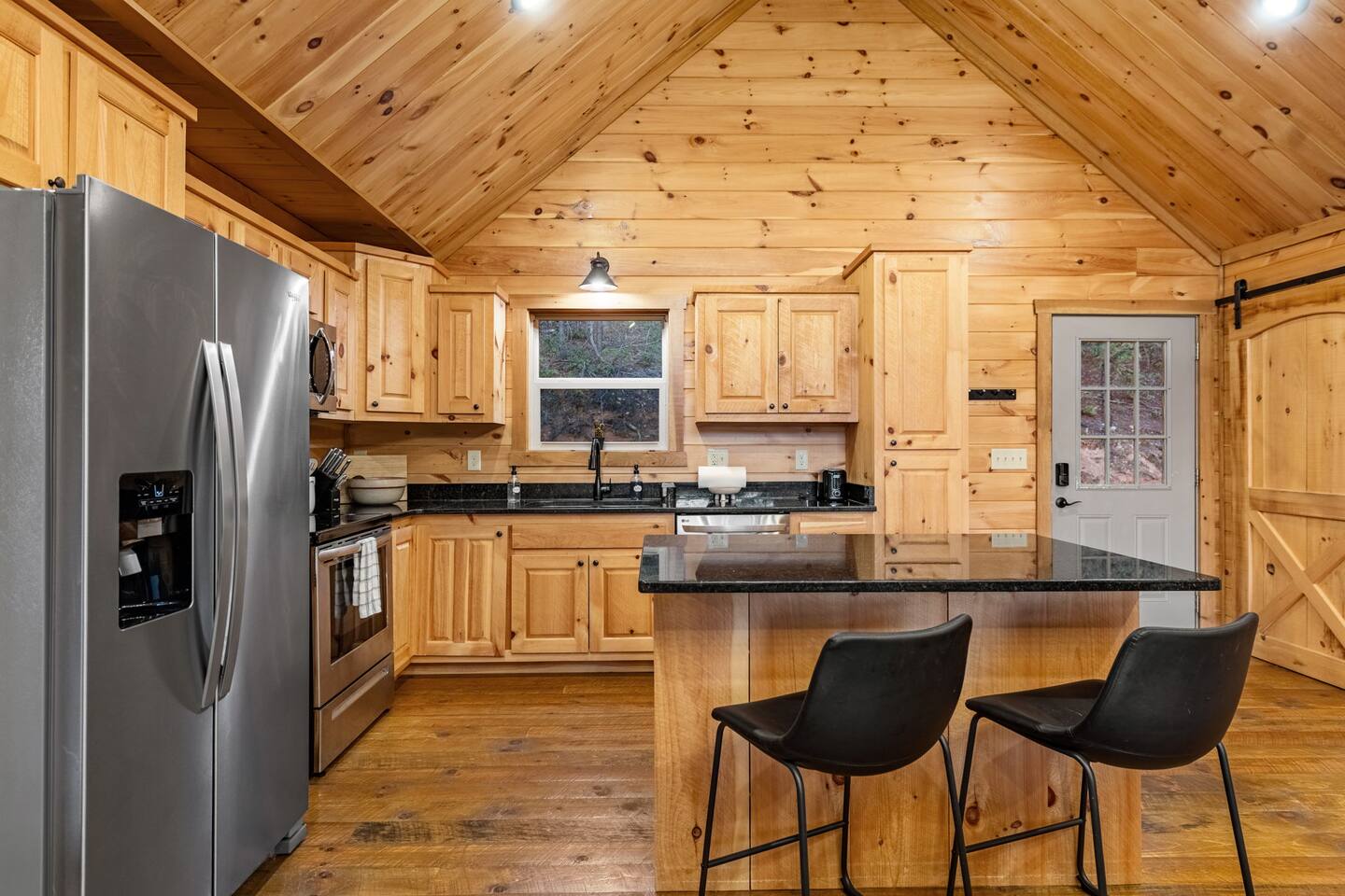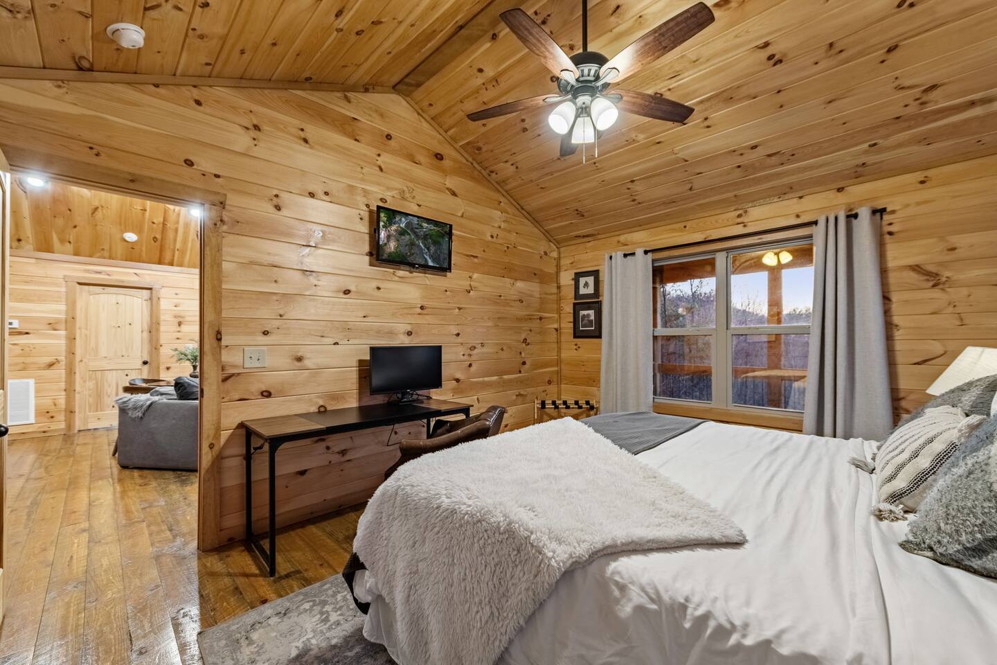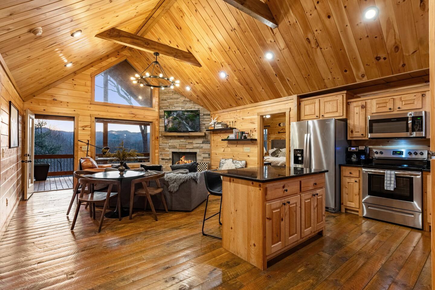 🛌 Two King Suites designed for deep rest and slow mornings 💻 Fast Wi-Fi + Dual Workspaces for extended stays and quiet focus 🌄 Panoramic Mountain Views from the covered deck and swings 🎬 Smart TVs in every bedroom and the main living space 🍳 Fully Stocked Kitchen for shared meals and easy mornings 🔥 Grand Stone Fireplace beneath soaring wood ceilings
